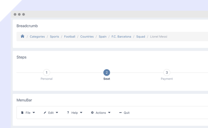 Menus: Abundant alternatives for menu components with menu bar, mega menu, context menu, panel menu based on the flexible MenuModel API.