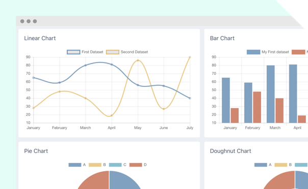 Charts: Create eye-catching charts with Chart components that include pie, line, bar, pole area, donut, and radar charts.